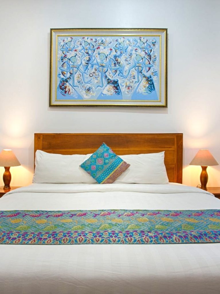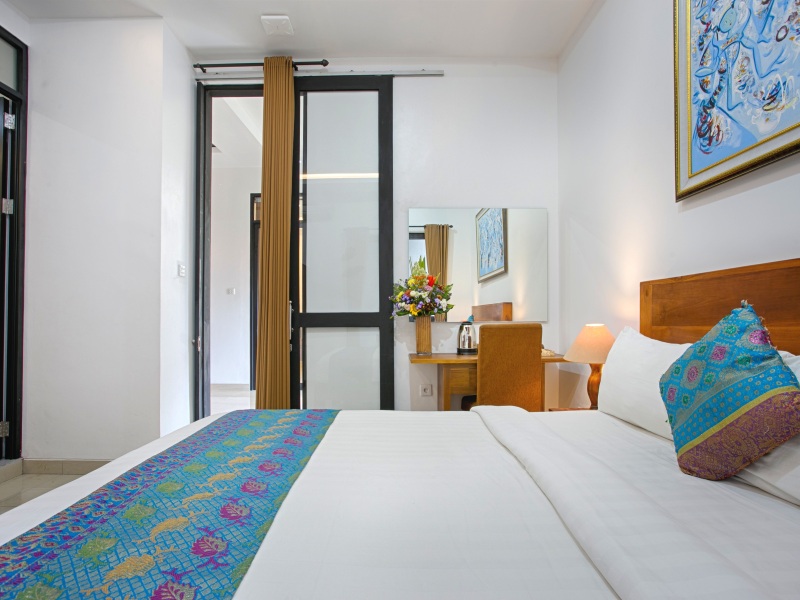 The 30 sqm Nelayan Suite on the top floor features a private balcony with stunning Canggu sunsets. Enjoy in-room breakfast, coffee, and local snacks. Includes Balinese décor, queen bed, 32″ LED TV, and a private bathroom with rain shower.