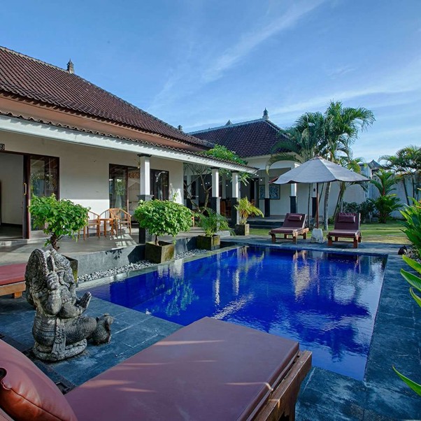 Designed with Balinese architectural elements, each villa features high ceilings, open layouts, and traditional Balinese artwork.